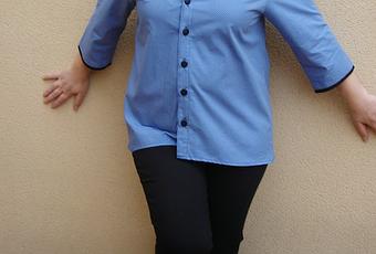 Este es el modelo de la camisa el bajo es desigual y si os fijais la camisa no lleva cuello camisero , sino una tira yo he cambiado esta tira por un cuello de camisa , me gusta mas como queda