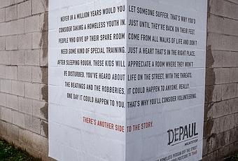 DePaul UK es una organización benéfica que tiene como objetivo proteger y encontrar un hogar a jóvenes sin techo para devolverles la esperanza y ofrecerles nuevas oportunidades que les permita llevar una vida normal.Su campaña de concienciación ha consistido en colocar unos carteles con distintos mensajes en la calle. Lo original de estos carteles es que se colocan doblados en esquinas, de forma que si los lees por una parte parece que el texto te está mostrando la percepción negativa que generalmente se tiene de las personas sin techo, sin embargo el texto finaliza con el rótulo "Hay otra parte de la historia" y por la otra parte se muestra un texto esperanzador mostrando los beneficios que puede aportar ayudar a estas personas.