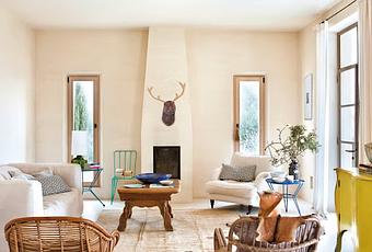 Nada mĂĄs cruzar la puerta, te recibe un salĂłn baĂąado en luz natural, con techos altos y paredes encaladas que abrazan la calidez de una chimenea de piedra natural. ¿Y sabes qué es lo mejor? Que aunque la base es neutra (blanco, madera, lino), los acentos de color los dan los accesorios: un cuadro rojo vibrante en la pared, un mueble antiguo pintado en un amarillo casi fosforescente, y sobre él, una copa verde azulada que le da ese puntito de alegrĂa mediterrĂĄnea que tanto nos gusta.