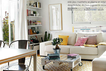 Vista del salón con piezas de diseño nórdico, detalles vintage y colores alegres. Mesa de centro hecha con palets de estilo industrial.