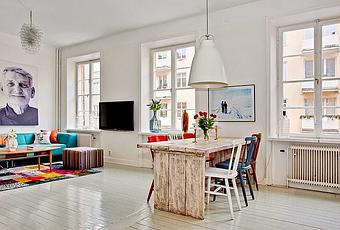 Que tu casa refleje tu personalidad es algo importantísimo para sentirte cómodo en ella, y eso es algo que saben muy bien los dueños de esta casa. La zona de estar presidida por dos grandes fotos de abuelo y nieto sobre un colorido conjunto de sofá, cojines, puf y alfombra, es espectacular. Además reconozco que la zona de comedor con muebles reciclado me tiene enamorada, la mesa realizada con viejos tablones de madera y las sillas restauradas con una mano de lija y dos de pinturas son realmente un rincón maravilloso. Una casa absolutamente única.