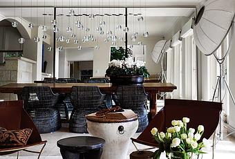 Y que mejor manera que poderla compartir con todos vosotros. La decoración de esta vivienda de fachada estilo clásico esta firmada por la interiorista Pamela Makin. En los interiores de esta casa se aprecian la neutralización de la paleta cromática, que se ve potenciada por los azulejos de mármol travertino y la piedra existente. Desde mi punto de vista, lo que hace interesante esta casa y sobretodo su decoración, es la mezcla de estilos y materiales. La diversidad de estilos esta presente en toda la vivienda, la mesa del comedor es una pieza antigua de roble francés que contrasta con una moderna lámpara de cristal y unos espejos con marco metálico. En esta sala se le añaden más estilos y elementos, como en la zona de estar, una mesa de centro de estilo corintio, acompañada por unos sillones Baxter y una lámpara de pie de Fortuny.