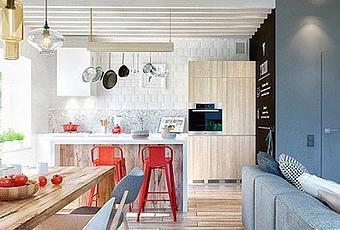 La cocina es un espacio abierto, con una distribución lineal de los muebles y una isla que hace las veces de barra de desayunos y separa la cocina propiamente dicha del comedor. En su decoración se jugó con muebles, revestimientos y encimera en blanco, superficies de madera en un tono intermedio, con vetas y nudos bien marcados, y pinceladas de color rojo. El resultado es un ambiente moderno, funcional, fresco y juvenil. El soporte para sartenes que cuelga del techo sobre la isla da un toque tradicional a la estancia, si bien su diseño de líneas rectas en madera clara está acorde con el resto de la decoración.