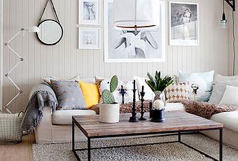 Blanco y gris esta muy visto ¿qué tiene esta casa de especial? El salón, la mesa de centro la preside un bonito cactus, además podemos encontrar eucaliptus y para rematar colores como el dorado y el mostaza ....ME DECLARO TOTALMENTE FAN hay que ver lo bonito que queda.
