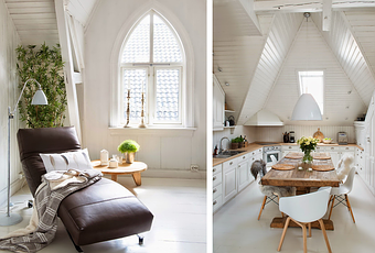 Una acogedora casa decorada en suaves tonos neutros con delicados detalles en materiales naturales y plantas. Pero lo que mas llama la atención son las tres torres que posee el edificio que crean un juego de techos abuhardillados en madera blanca. Otro elemento que contribuye al encanto de esta casa son sus ventanas en forma de capilla.