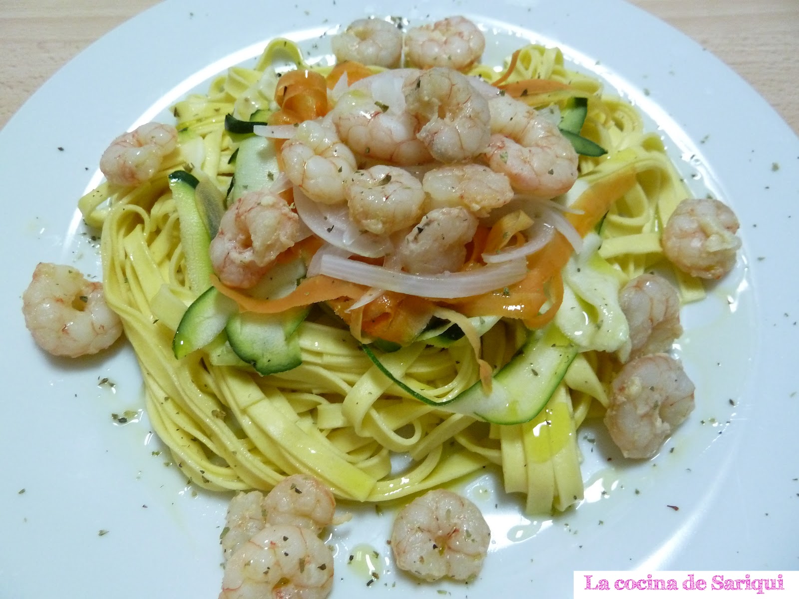 Mientras tanto, pon una sartén al fuego con un chorrito de aceite, añade el ajo picadito y cuando esté doradito agrega las gambas peladas y saltea.Cuando tengas la verdura y las gambitas a punto, cuece la pasta durante cuatro minutitos y sírvelo todo junto.