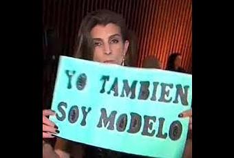Con un vestido de lentejuelas negro y una seguridad propia de modelo, Cris, como le gusta que la llamen, se coló en el desfile mostrando un cartel que decía “Yo también soy modelo”.