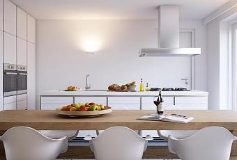¿Os imagináis una cocina como esta? yo no saldría de ella más que por las noches para irme al súper sofá y ver mi serie favorita. Electrodomésticos integrados perfectamente, muchísimo sitio de almacenaje y maniobra, chorros de luz natural que se reflejan en el blanco de los muebles, todo encastrado en un fondo gris oscuro que hace la cocina tan elegante. Y para rematar una mesa de madera natural maciza con 6 sillas de diseño en blanco (Eames Plastic Armchair) alrededor. Seguro que si cocinas aquí sabe mejor :P Especial atención a ese larguísimo armario blanco colgado en la pared entre la cocina y el salón, me lo pido!!