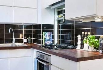 Los 3 metros de altura al techo permiten colocar una doble fila de armarios superiores, al mismo tiempo que la repisa de la ventana lateral sirve de mesa de almacenamiento. La nevera por contra tiene que ocupar un lugar en el comedor, un justo precio a pagar por otra parte, por una cocina tan pequeña pero bien acondicionada, con mobiliario blanco y encimera de madera maciza.