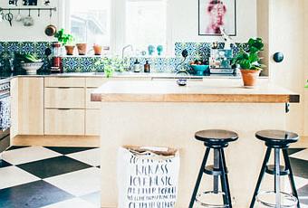 Lo más llamativo en esta cocina es la combinación del suelo damero con el zócalo de hidráulicas azules, acertada mezcla.