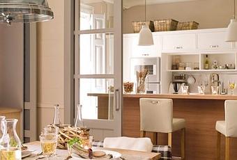 Una cocina rustica donde la atencion pasa por un vano de puertas correderas para descubrir un comedor integrado unico.