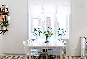 Está en una casa sueca, eso parece innegable, ¿verdad?, por varios detalles: el absoluto predominio del color blanco en suelos, paredes y mobiliario, la preciosa chimenea de cerámica, tipica de esas latitudes, etc.