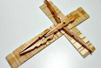 Para realizar esta cruz, he utilizado 11 pinzas de la ropa, de las de madera. También utilicé tintas Distress para darle un poco de color al Cristo (aquí también puedes dejarlo al natural o pintarlo con lo que más te guste) y pegamento. Ya ves que de materiales necesitaremos bien pocos.