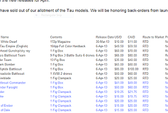 Desde Faeit212 llega esto.Al parecer es una hoja que indica el re-stockaje de material de las novedades de los Tau del mes de Abril.Es solo para las tiendas de EEUU y Canadá por lo que se ve, así que en Europa no debería afectar y ser simplemente una curiosidad.Aquí en Islandia puede ser de interés (A mi no,no juego con Tau,pero bueno.Es material util para todos),ya que en esta zona se suplen tanto de Europa(Por la cercanía con la Escandinavia continental) como con EEUU(Que tampoco les queda excesivamente lejos y hay bastante población de ascendencia americana o que pasa parte del tiempo en EEUU y otra aquí),lo cual permite aquí poder adaptarse mejor según como les vengan las cosas.