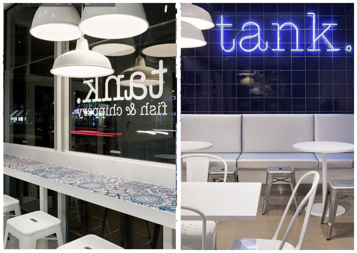 Do you fancy fish and chips? Tank, situated in Carlton, Australia, offers high quality and fresh fish in an amazing corner shop and with a Greek inspired menu. This restaurant from 1980's has been recently renovated by Anna Drummond, who has respected the traditional and charateristic blue tiles but bringing a modern touch with the Tolix stools and the neon Tank sign.