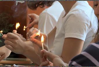 En la imagen un fotograma de la película “Entre maestros”. En la escena se muestra el momento en el que cada alumno ve reflejada su propia sabiduría, símbolo de su riqueza interior, en la luz de la cerilla que sostiene. Unos a otros se traspasan el fuego, encendiéndose las cerillas, comprendiendo que la luz de uno es también la luz de todos.