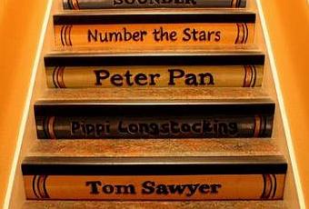 Nos ha parecido genial esta idea para decorar una escalera. Se trata de pintar cada escalón como si fuera el canto de un libro con su titulo y todo. Una manera genial de hacer un homenaje a nuestros libros favoritos a la vez que decoramos la casa.