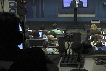 Por segunda vez en esta legislatura muchos periodistas hicieron de público en la teleconferencia de ¿prensa? de un presidente encapsulado en una televisión de plasma y que no da la cara: