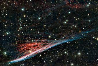 Esta nueva imagen muestra inmensas y tenues estructuras filamentosas, nudos de gas más pequeños y grupos de gas difuso. La apariencia luminosa de la nebulosa proviene de las densas regiones de gas que han sido impulsadas por la onda de choque de la supernova. Dado que la onda de choque viaja a través del espacio, atraviesa la materia interestelar. Al principio, el gas se calentó millones de grados, pero posteriormente se enfrió y aún emite un débil brillo, captado en la nueva imagen.