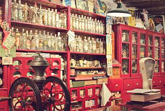 Actualmente tienen seis tiendas: la farmacia, la barbería, el estanco de tabacos, la mercería-perfumería, el ultramarinos y el bar. Cada una de ellas con un sinfín de objetos y detalles impresionante. No sé con cual me quedaría. La farmacia fue la primera que visitamos, en ella descubrimos un montón de medicamentos muy chocantes vistos desde la perspectiva actual, cómo por ejemplo unos cigarrillos para el asma, hasta medicamentos que se publicitaban directamente diciendo que contenían cocaína.