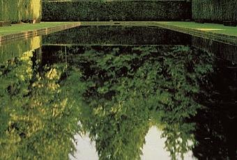 El jardín de los planos (desaparecido). Versión original de la propuesta de R.Haag. Bloedel ReserveEl siguiente tramo discurría otra vez por una zona de bosque muy densa, donde se concentraban numerosos árboles caídos cubiertos de musgos y mohos de los más fantásticos colores y formas. La percepción de la decadencia de las masas vegetales ofrecía un aspecto sobrecogedor y hacia que se recorriera con temor. Al cabo de algunos minutos llegaríamos a un pequeño pabellón japonés frente al cual se desplegaba un pequeño jardín pétreo a la manera del que existe en el templo de Ryoanji de Kioto. Allí nos sentaríamos en las gradas de madera situadas en el exterior del edificio para contemplar la composición de pequeñas colinas en el fondo, cubiertas de hierbas que formaban sutiles variaciones cromáticas sobre el verde.