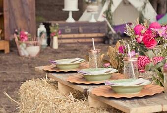 Como digo, hay un montón de detalles bonitos, una improvisada mesa de paja, cojines coloridos, plumas y miles de detalles cuidados como las tartas , a cargo de una empresa de catering.