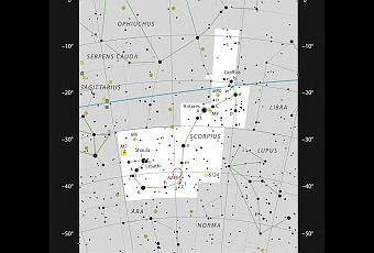 Imagen de la constelación de Scorpius. La mayor parte de las estrellas de la imagen que pueden verse a simple vista en una noche oscura están marcadas. La ubicación de la región de formación estelar llamada la Nebulosa de la Gamba (IC 4628) está señalada con un círculo rojo. Esta nube parece grande, pero es muy débil y no puede verse con un telescopio pequeño. Créditos: ESO, IAU and Sky and Telescope.
