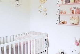 Una habitación llena de dulzura y muy femenina … peluches adorables como las gotas de agua, las nubes de madera, una ratita presumida … objetos originales y delicados. La mayor parte de ellos lo puedes encontrar en: Los muebles: allobébé/ Estrellas: The Butter Flying / Stickers: DecoBB / Cisne: French Blossom /Mesa y lámpara: Smallable /Juguetes: Yellow Flamingo