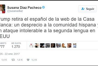 Resulta que ante la retirada de la versión en español de la página web del Gobierno norteamericano la izquierda ha salido en tromba, criticando esa decisión; decisión que no ha sido tal, pues fuentes de la administración Trump ya han dicho que están rediseñando contenidos y que sí habrá versión en español. Y esta izquierda tan valiente y tan preocupada por el tratamiento que se le da al español en los Estados Unidos calla con el trato que recibe el español en Cataluña, donde la gran mayoría de los ayuntamientos y demás administraciones lo obvian en sus documentos oficiales, en sus páginas web y en el uso diario. Esa es la realidad de Cataluña. Y todo esto con el apoyo del PSOE. ¿Para cuándo un tweet de Susana Díaz criticando la política lingüística de la Generalidad de Cataluña? Será que el hecho de que no se pueda rotular solo en español no es un problema para el PSOE, pero lo de la web de la Casa Blanca sí… Pero no solo con el tema lingüístico, esta izquierda está haciendo el ridículo en todos los extremos. Ahí está el tema de la globalización, algo contra lo que la izquierda lucha, atacando la libertad de mercado. Y ahora cuando llega Trump y dice que va a romper con la globalización económica va la izquierda y también lo critica. Esta es la izquierda que tenemos, una izquierda que se preocupa por lo que ocurre en USA pero no por lo que pasa en España. Porque es una izquierda de salón, una izquierda hipócrita que actúa de cara a la galería, que no mira por España.