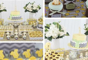 Fuente: @art.desir Detalles que no quieres perderte en este delicado Baby Shower, tiene como colores principales el amarillo, gris y verde en tonos pasteles con un lindo coche en el centro enmarcada con guirnaldas y rosetones se resalta la pequeña jirafa en el top de la torta, los dulces en su papelería personalizada de forma individual y los recuerdos con la jirafa sobre el envase con una dedicatoria o simplemente el nombre todo exquisitamente colocado de forma simétrica sobre la mesa para el deleite de los invitados