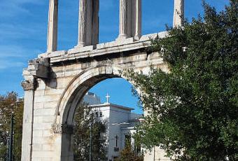 Hoy vamos a dar un céntrico paseo por la ciudad moderna, siempre de sur a norte. Y comenzamos precisamente muy cerca, en una Atenas aún romana. Aquí, a la derecha del estadio, estaba una de las puertas de entrada a la ciudad antigua, la de Teseo, mirando a la Acrópolis. Cuando llegaron los romanos, allá por la segunda centuria de nuestra era, el emperador Adriano quiso dejarlo claro construyendo en el mismo lugar una puerta monumental en mármol. Es la conocida como Arco de Adriano, un sólido arco de medio punto sobre el que se levanta un triple pórtico de columnas, todo ello rematado en arquitrabe y frontón triangular.