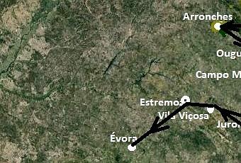 Pero el “embudo de contención” alentejano superaría con creces estas construcciones de defensa e impulso a la infiltración, teniendo ante Badajoz una inmediata tenaza primero de fortalezas medievales y después revestidas de abaluartadas, con enorme despliegue técnico: Campo Maior al norte, Elvas al centro y Olivença al sur. Vanguardia fortificada de impresionante alarde bélico y extraordinaria belleza monumental mirándolo como legado histórico.A esta línea de inmediato choque le sucede como una primera e inmediata retaguardiaotro conjunto donde igualmente lo medieval ha sido revestido a partir de la Guerra de Restauração de 1640-1668: Arronchesmás al norte de Campo Maior; Ouguelaen el norte inmediato, y Juromenha a espaldas de Olivenza, a orillas del Guadiana.Estrechándose ese “tubo de embudo”, internándose hacia el inmenso llano alentejano que lleva cómodamente hacia Lisboa, una segunda, casi horizontal línea de retaguardia: Vila Viçosa, Estremoz y Évora. Otra vez más lo medieval se reviste de abaluartado, y -como los anteriores- protagonizan importantes confrontaciones entre portugueses y alentejanos, con sus respectivos aliados, ingleses y franceses en la Edad Moderna, tras las guerras de frontera anteriores ante las conquista a los musulmanes.De todo ello nos ha quedado un patrimonio artístico-monumental verdaderamente extraordinario, único; testimonio singular de una prolongada época de lucha fronteriza, en muy buena parte preservado en cuanto a su integridad y autenticidad. Digno de contemplarse, “leerse”, disfrutarse en serie.RECORRIDO POR LAS LÍNEAS DE CHOQUE Y CONTENCIÓN.