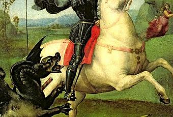 (Imagen del Cuadro de Rafael Sanzio (1483-1520) San Jorge y el Dragón, 1504, Louvre, París; Cuadro del pintor simbolista francés Gustave Moreau (1826-1898) San Jorge matando al dragón.)