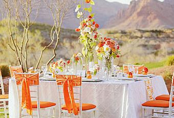 Las sillas con lazos naranjas, y .... muchos centros de flores.