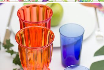- Para crear nuestra decoración de mesa tropical, lo primero de todo es pensar en la base: un mantel bonito siempre garantiza un resultado impecable (consejo de mi madre que sigo a pie de la letra desde que me independice y funciona os lo aseguro). Para nuestra mesa hemos contado con un mantel en el que la fauna y los loros se han auto-invitado al festín… acompañado de vasos de colores en distintos tonos conseguimos un vitalismo increíble.