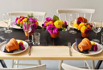 - Reparte unas macetas de barro con coloridas y alegres flores por el camino de mesa.