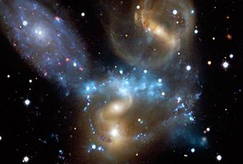 Esta bella imagen es una mirada diferente sobre el quinteto de Stephan, un grupo compacto de galaxias descubierto hace unos 130 años que se encuentra a unos 280 millones de años luz de la Tierra. La curva de luz azul de canto que recorre el centro de la imagen muestra los datos de rayos X del Observatorio Chandra. Cuatro de las galaxias en el grupo son visibles en la imagen óptica (amarillo, rojo, blanco y azul) del Telescopio Canadá-Francia-Hawai. Las galaxias son NGC 7317, NGC 7318a, NGC 7318b y NGC 7319, así como una galaxia en primer plano prominente catalogada como NGC 7320, que no es un miembro del grupo. La galaxia NGC 7318b está pasando por el núcleo del grupo de galaxias a casi 2 millones de millas por hora, y se cree que está causando la cresta de la emisión de rayos X mediante la generación de una onda de choque que calienta el gas. El calor adicional es causado por explosiones de supernovas y vientos estelares que también han tenido lugar en el quinteto de Stephan. Un gran halo de emisión de rayos X, no visible en la imagen, detectado por la ESA XMM-Newton podría ser una evidencia de los golpes de calentamiento por las colisiones entre galaxias anteriores de este grupo.