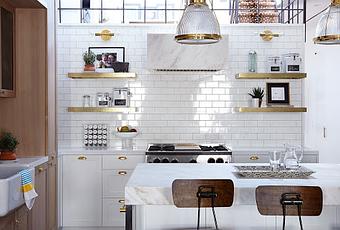 La cocina que hoy os muestro, en un apartamento del neoyorquino barrio de Tribeca, creo que satisfará a los dos "bandos" en contienda, ya que, a pesar de tener cachivaches a la vista, estanterías vistas, numerosos elementos decorativos, es una cocina que transmite orden y limpieza. Me gusta especialmente porque a pesar de ser moderna, no tanto como para ser aséptica. Hay elementos que transmiten calidez como las sillas vintage de oficina en la barra de desayunos, las lámparas de estilo industrial, las baldosas metro o los elementos dorados (por ejemplo en la grifería) que imprimen elegancia y clasicismo.