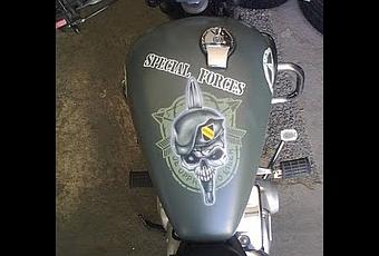 Se trata de una Yamaha. La pintura que apliqué fue un verde "militar" y el acabado es un barniz mate. En el depósito figura una caravela con las letras aerografiadas "SPECIAL FORCES" y dos estrellas a ambos lados del depósito. ¡Que Disfruten!