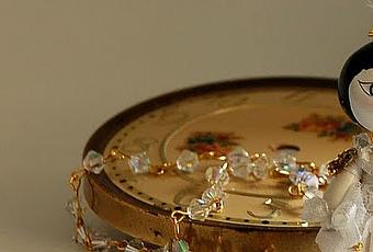 Luce un vestido elaborado en seda natural blanco, ricamente adornado por puntilla, pequeños lazos, filigranas doradas y pequeñas lentejuelas en forma de camelias. Complementa el conjunto un delicado tocado de plumas y lentejuelas doradas
