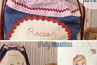 Es una nueva bolsa con una nueva muñeca con su uniforme escolar hecha como regalo para el cumple de otra muñequita llamada Rocío, está hecha con mucho cariño para que la acompañe en sus excursiones por el día a día.Tiene unos colores cálidos y está confeccionada con una resistente loneta pero está forrada con una tela rosa de rayas que le da ese toque dulce que me gusta...