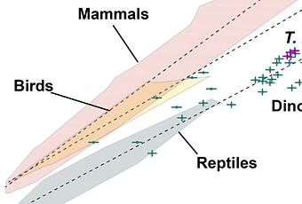 La relación entre el cerebro y la masa corporal en los vertebrados terrestres. Los dinosaurios como el T. rex tenían proporciones de tamaño de cerebro a cuerpo similares a las de los reptiles vivos. Crédito: Cristian Gutiérrez Ibáñez