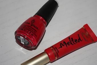 Buscando en el cajón de los esmaltes apareció este rojo con destellos de China Glaze, de la Colección Avant Garden (os hablé de el aquí), es el Snap My Dragon y queda perfecto con el labial de Too Faced.