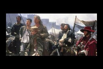 En primer lugar, está la cuestión religiosa. Uno de los fenómenos que presenta la película es el del fanatismo interesado, esto es, la fabricación ad hoc de un credo religioso que, fundamentado en un hecho fortuito y completamente desprovisto de todo contenido sobrenatural (en este caso el descubrimiento, enterrado en el barro, de una estatua de San Martín, el único santo provisto de espada), es sin embargo interpretado como una señal divina y asumido como bandera y programa de vida. Esto hace que el grupo de mercenarios, que se vendía al mejor postor, se dote de una “ideología” fanática y elija a Martin, el personaje de Rutger Hauer, no ya como estratega militar o mejor guerrero del grupo, sino como santo, como papa, como gurú. Por supuesto, lo primero que Martin va a hacer en su nuevo cargo es utilizar esta circunstancia a su favor: después de violar a Agnes, celoso de que los demás puedan hacer lo mismo, no desaprovecha su nueva autoridad para manipular las circunstancias y, por un lado, reservarla para él y, por otro, dirigir las actividades del grupo hacia otros intereses que lo distraigan, la conquista de un castillo (el castillo de Belmonte, en Cuenca), que a la postre significará su ruina. En este aspecto, destaca la paradoja de dos crudos suicidios que protagonizan dos personajes aparentemente piadosos (el suicidio es pecado mortal, por supuesto…), el de la madre que se arroja con su hija desde la torre para no caer en manos de los conquistadores, y el de Miel, el mercenario homosexual (pareja del que interpreta Bruno Kirby) que utiliza la pared para empujar la espada que acaba con su vida. Estos actos sugieren unas relaciones del individuo de aquel tiempo con la religión mucho más laxas y aparentes que verdaderamente consecuentes con una presunta creencia sólida. Este hecho queda subrayado ironicamente tras la primera relación sexual consentida de Martin y Agnes: antes de ella, Martin ha impuesto a su grupo una vestimenta que incluya el rojo; después, sin embargo, ambos asumen el blanco, ella como virgen y él como papa de esa nueva religión de bolsillo que se han creado para su propia conveniencia y cuya doctrina el cardenal del grupo (Ronald Lacey, famoso por hacer de nazi enfrentado a Indiana Jones) va improvisando sobre la marcha gracias al alcohol y a sus brotes de inspiración a la vista de la estatua armada de San Martín.