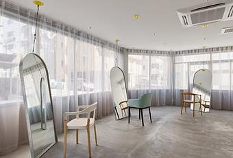 Un local con ventanales a la calle en esquina que cuenta con finas cortinas para tamizar el ambiente interior, donde nos encontramos con un concepto recogido, mínimo, con ausencia de toda decoración superflua y donde únicamente encontramos suelo de hormigón, unos asientos, y espejos con apoyo en suelo y gancho de tensor ubicado sobre marcados puntos amarillos en techo.