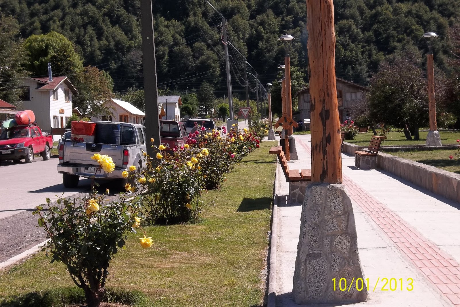 Este bello lugar de reunión, de descanso, de encuentros o de postas pueblerinas: la plaza, dispuesta en el centro del pueblo, prolijamente cuidada, con bancos y basureros de madera de árboles propios de la zona, dos bustos en bronce, erigidos en honor de dos de los próceres más destacados de la historia de Chile: Bernardo O´Higgins, llamado padre de la independencia y Arturo Prat, considerado su máximo héroe naval. Adornada con especímenes majestuosos obtenidos de los bosques patagónicos que integran, en este lugar, una biosfera binacional, esta plaza chilena, sorprende por sus dimensiones. En verano, el pueblo y la plaza ostentan rosales de todos colores.