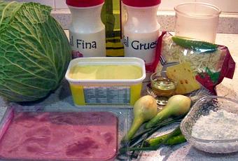 - 1 taza de harina- 250 ml de leche - 250 gr. de jamón cocido- 1 cebolla grande- 1 vasito de vino blanco- Queso rallado para gratinar- Sal, pimienta blanca, nuez moscada.