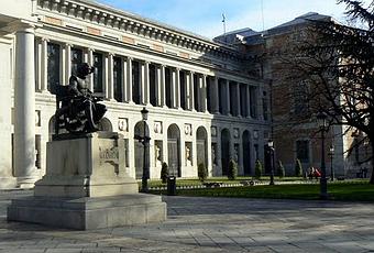 (Fotografía del Museo del Prado, con la estuatua del gran Velázquez enfrente; Óleo del pintor flamenco David Teniers, El archiduque Leopoldo en su Galería de Pinturas en Bruselas, 1650; Óleo El Pasmo de Sicilia, del pintor del renacimiento italiano Rafael Sanzio, 1516; Cuadro Un Anacoreta, siglo XVII, del pintor español José de Ribera; Cuadro del pintor sevillano Murillo, Sacra Familia del Pajarito, 1650; todas estas pinturas ubicadas en el Museo del Prado, Madrid, España; Reproducción de la portada del periódico El Liberal, Madrid, 1879; Grabado con el retrato del periodista Mariano de Cavia.)