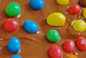 Just chop the chocolate, put it in a bowl and place it on boiling water (bain-marie) and stir until it is completely melted. Line a crystal tray with parchment paper and pour the melted chocolate on it, dropping M&M’s all over it and let it cool.