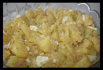 Patatas2 huevosCebolletaPerejil2 latas de atúnSalAceite de olivaVinagre de JerezPreparaciónCocer las patatas, sin pelar! (se aprovechan mucho más y es más rápido)Añadirle los últimos 10 minutos los huevos para cocer.Dejar que se templen, pelarlas y trocear juntos con los huevos, la cebolleta y el perejil.Añadir la sal, aceite y el vinagre.listo.Y... como esto no fue suficiente y hay muchas ganas de ir al sur!.